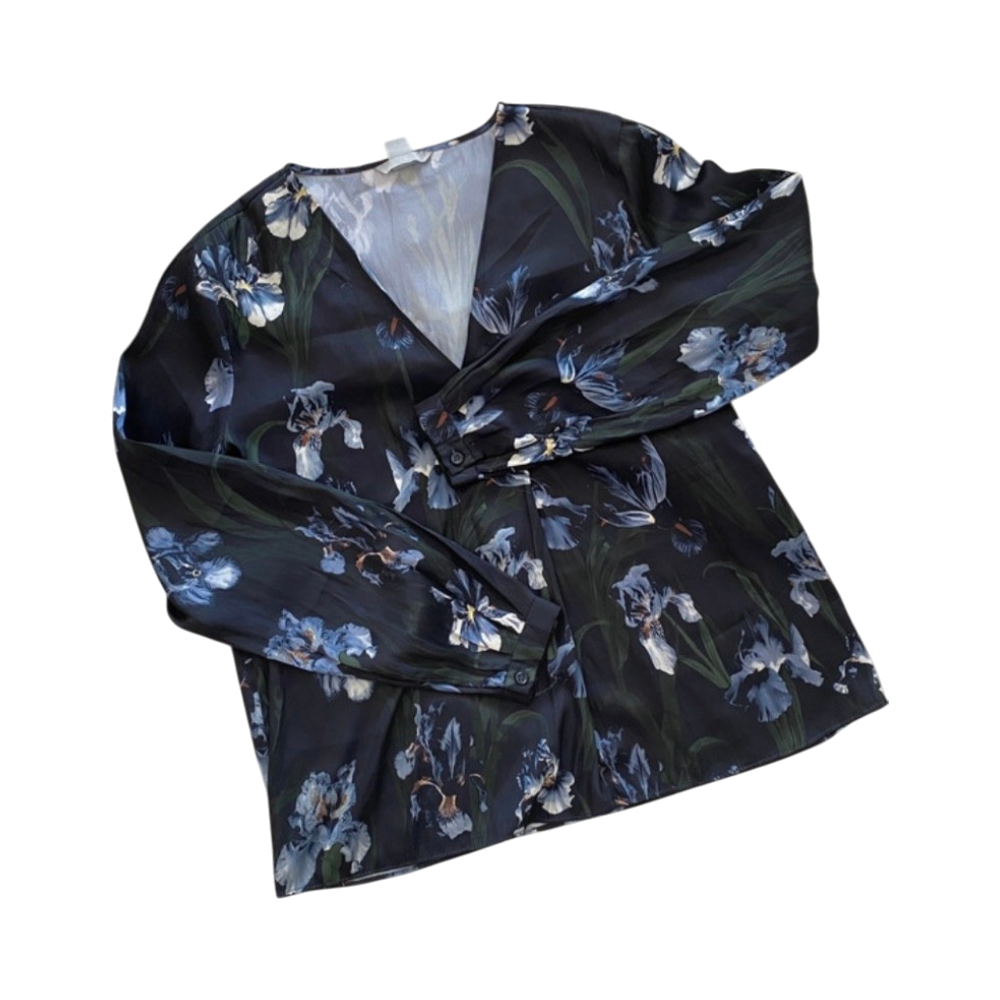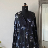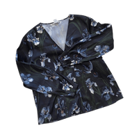 V-aukko, pitkähiha, musta sinisellä kukkakuosilla.