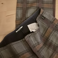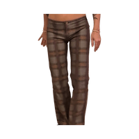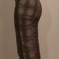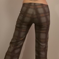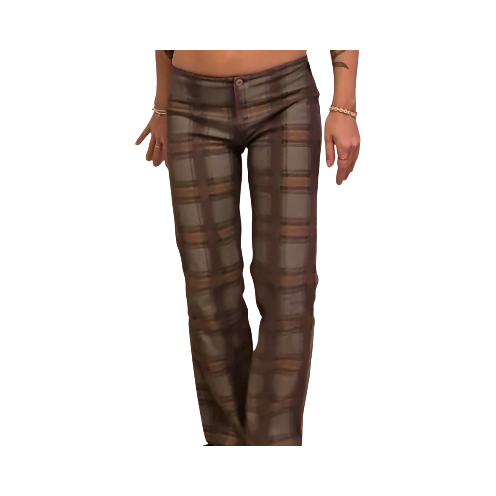 Harmaat plaid-housut, suora lahje, napillinen matala vyötärö.