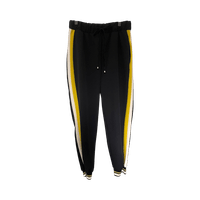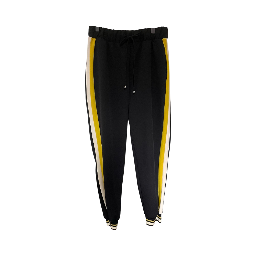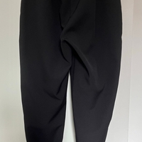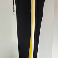 Mustat housut sivuraidoilla, resorit nilkoissa ja nyöritys vyötäröllä. Taskut edessä. Laadukkaasta puvunhousukankaasta.