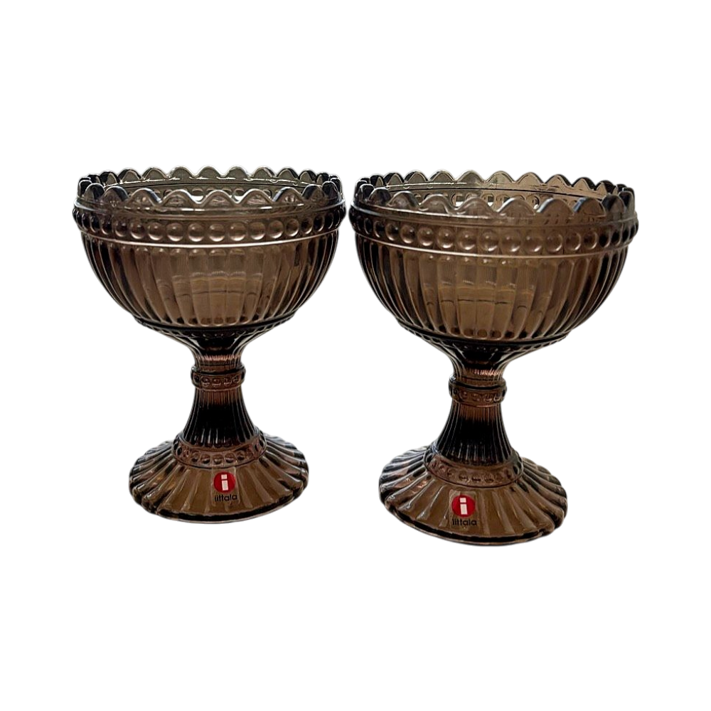Kaksi Iittalan pientä Mariskoolia, väri hiekka, korkeus 12cm/120mm, alkuperäinen tarra paikoillaan molemmissa. Ei virheitä tai käytönjälkiä.