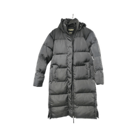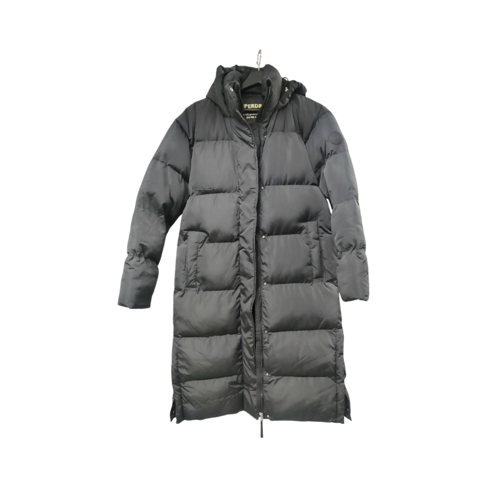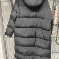 Pitkä ja lämmin hupullinen toppatakki, vetoketju- ja nappikiinnitys. Halkiot napeilla sivuilla. Reilu koko. Käytetty hyvin vähän, lähes kuin uusi.