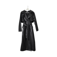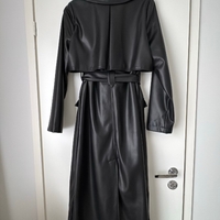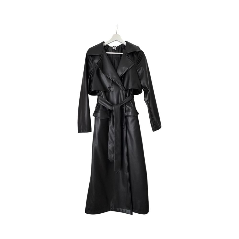 Pitkä, vyöllinen keinonahkatrenssi, joka tuo asuun särmää ja eleganssia.