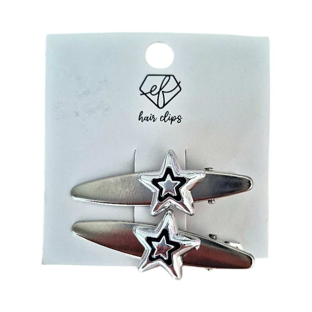 Hopeiset hiusklipsit mustilla tähtikoristeilla, 2 kpl.