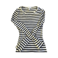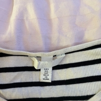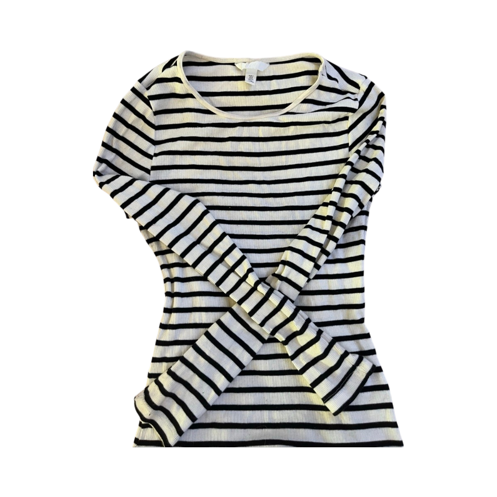 Valko-musta raitapaita, pitkähiha, ohut ribbineulos.