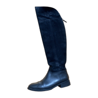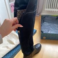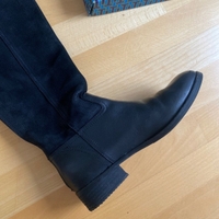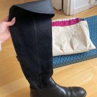 Mustat ylipolven/pitemmät saappaat. Kenkäosa sileää nahkaa, varsi pehmeämpää mokkatyyppistä nahkaa. Pohjiin teetetty puolipohjat ja korkolaput. Kunto muutoin erittäin hyvä mutta korkolaput hieman kärsineet. Koko 8M eli 38.
