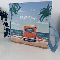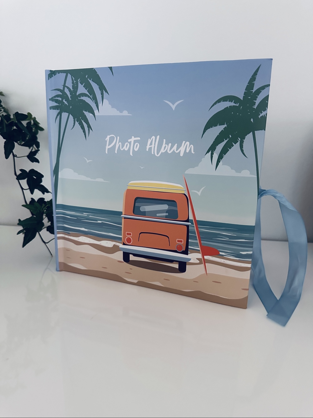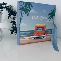 Sininen valokuvakirja, nauha ja meriaiheinen kansi. 200 kuva