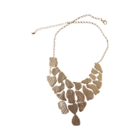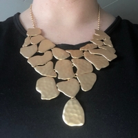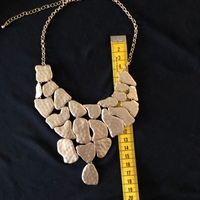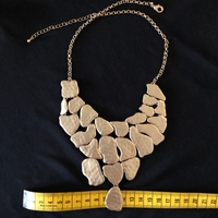 Kerran käytetty näyttävä ja iso kullanvärinen kaulakoru. Ketjun pituus säädettävissä 35-56 cm. Korun paino 78 g. Valmistettu kierrätysmateriaalista: 75% sinkki, 20% teräs ja 5% messinki.
