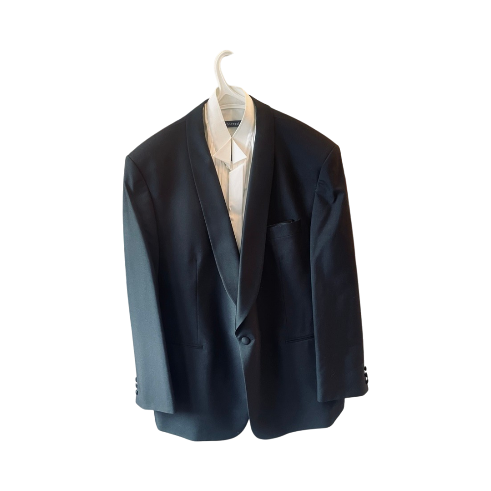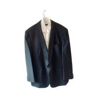 Musta smokki, 55% polyesteriä, 45% villaa. Sis. housut + paita.