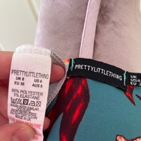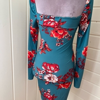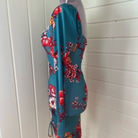 Long-sleeve turquoise dress with red floral print and ruched front.
