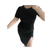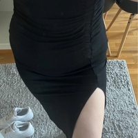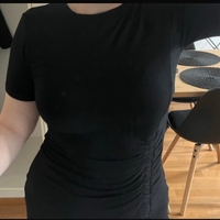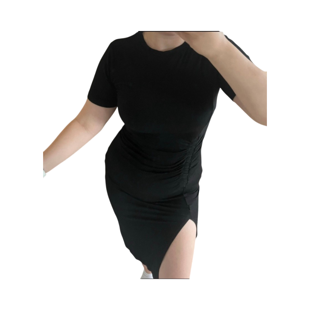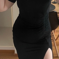 Musta t-paitamekko, sivuhalkio ja rypytys.
