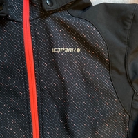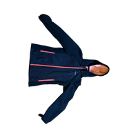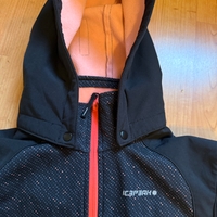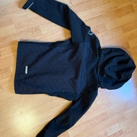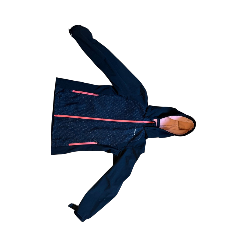 Girls' softshell jacket with hood and front zipper, size 13-14. The other velcro in the hand is not sticking but it doesn’t affect it.