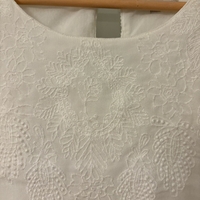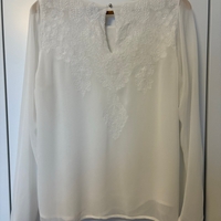 Kevyt pusero, kirjailtu yläosa. Kaunis kirjailtu valkoinen pusero pyöreällä kaula-aukolla. Hihat yksinkertaista kangasta ja vartalo osa kaksinkertainen. Hihat läpinäkyvät, vartalo osa kuultava. Nappi suljenta takana.