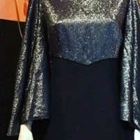 Musta villakankainen, alaspäin levenevä helma. Istuu vyötäröltä upeasti. Yläosa on hopean väristä kimallekangasta. Ihanat, kevyet "enkelihihat". Takana vetoketju, vuorillinen. Kotimainen. Finnish design | Hyvilla Oy.