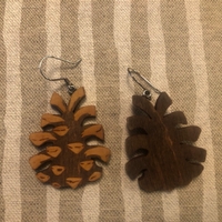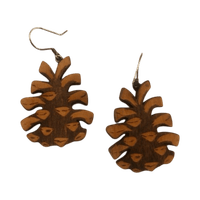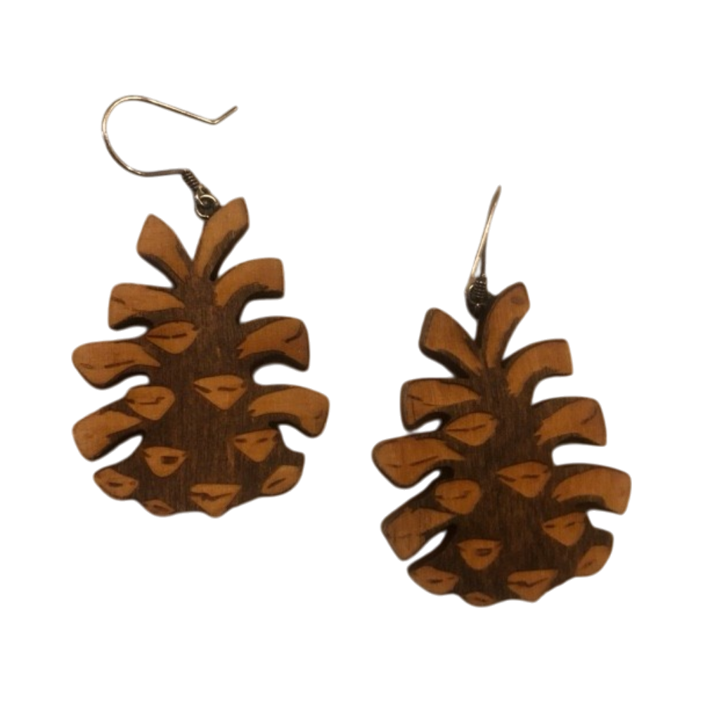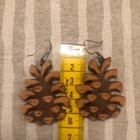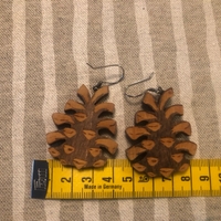 Puiset Pinjapuun pienemmät käpykorvakorut. Korkeus 4,5 cm ja leveys 3,5 cm. Materiaalina suomalainen koivuvaneri, koukut nikkelivapaata koruterästä.