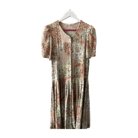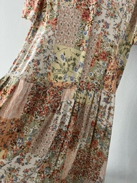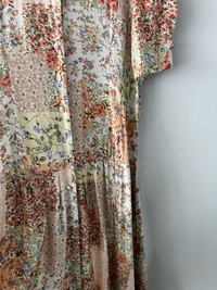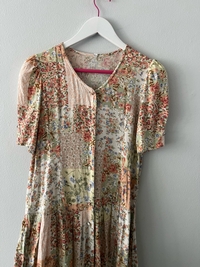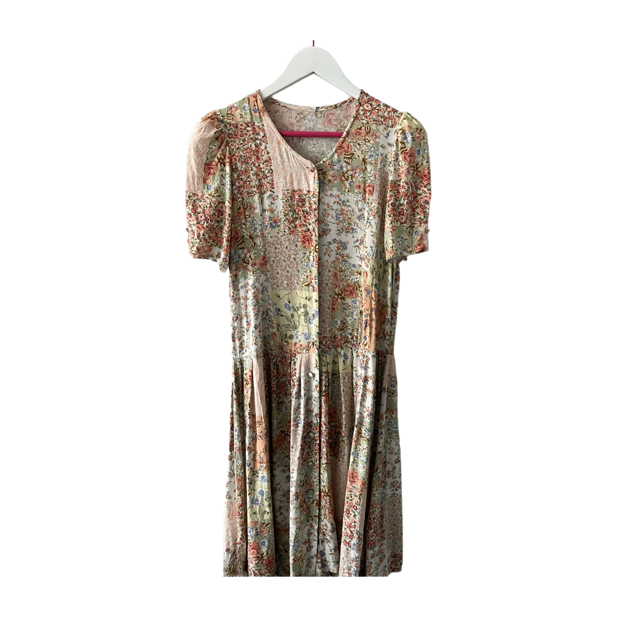 Suloinen Vintage kukkamekko, polvipituinen. Yleisilme hyvä, selän puolella pieni reikä, joka ei ole huomattava käytössä. Pehmeä ja hyvin laskeutuva. Koko s, pituus 96cm, kai kai mitta 48cm ja vyötärönympärys noin 80cm