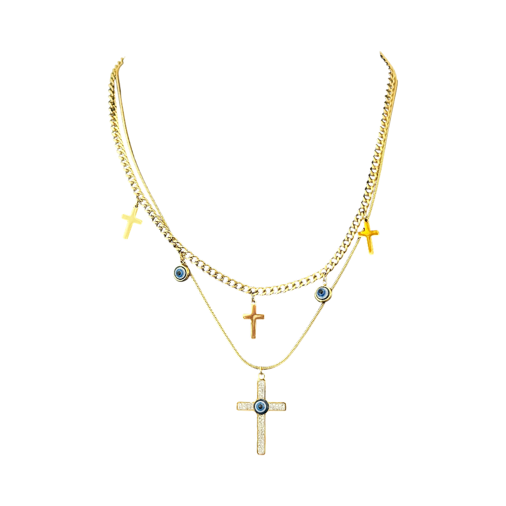 Tyylikäs ketju, jossa ristejä ja silmiä.