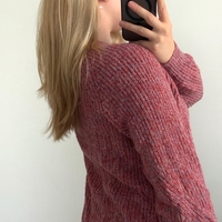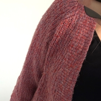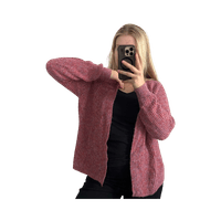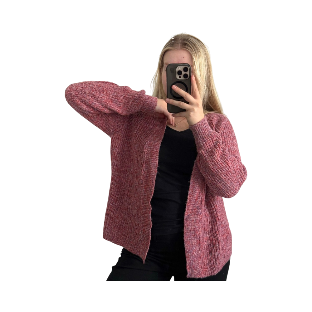 Open-front pink chunky knit cardigan, cozy and slightly oversized.