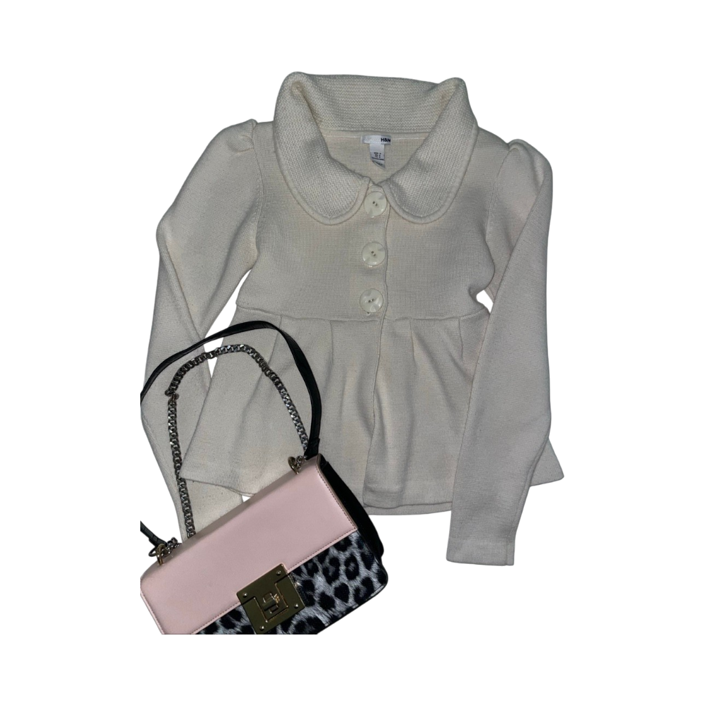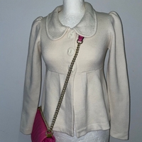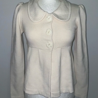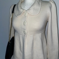 Hieno vaalea neuletakki napituksella ja kauniilla kauluksella.
