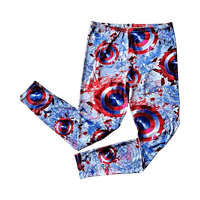 Marvel Captain America legginsit. Paljon pidetty mutta edelleen siistit (pinta sileä, ei nukkaa tai nyppyjä) ja ehjät vaikka jousto ei enää yhtä napakka kuin uutena. Kokolapusta merkintä haalistunut, mutta ovat todnäk kokoa L: vyötärön leveys 41 (vyötärökuminauha melko löysä), lahkeen pituus haarasta 78cm.