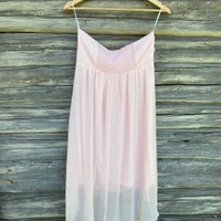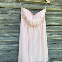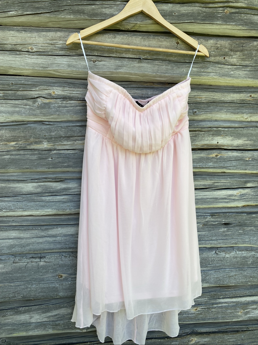 Kaunis vaaleanpunainen mekko, koko L. Olkaimet säädettävät, ne saa halutessaan myös pois. Vain testattu päälle, laput kiinni.