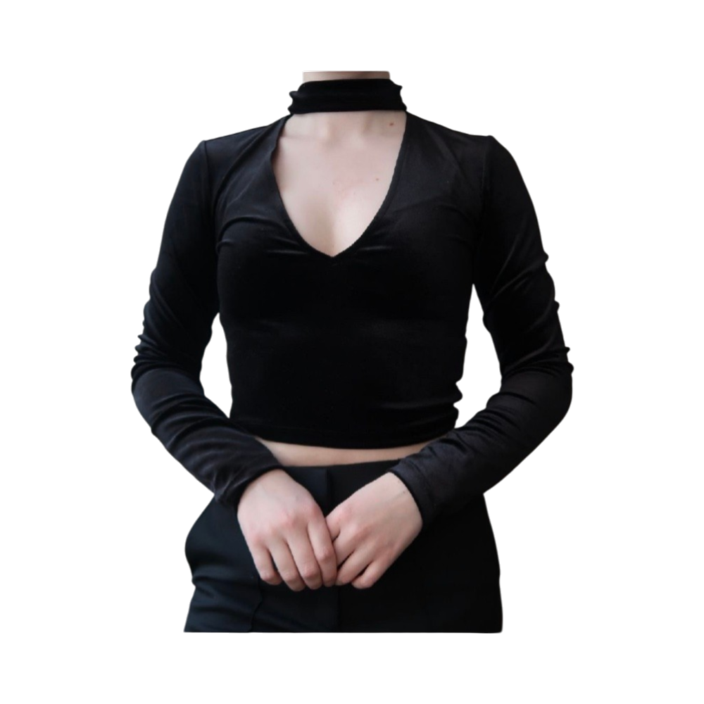 Musta pitkähiha‑croptop, syvä V‑aukko ja kaulusdetail.