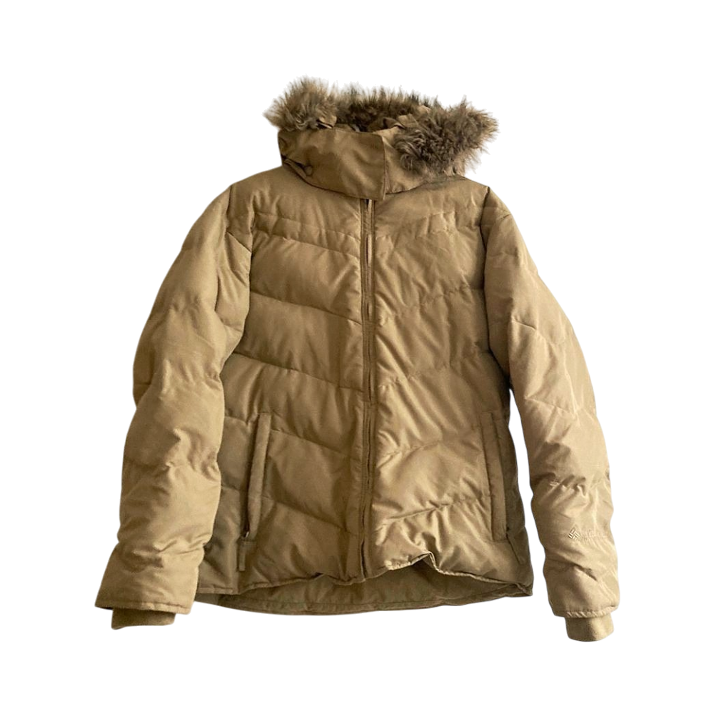 Keywords: Columbia, down jacket, puffer coat, warm jacket, winter coat, faux fur hood, beige, neutral, hiking, camping, outdoor wear, snow jacket, cold weather, activewear