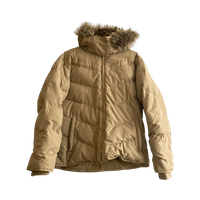 Columbia women’s warm beige down puffer jacket in size L. Features a removable hood with faux fur trim, two zipped side pockets and an inner zipped pocket. Fleece inner cuffs for extra warmth. Embroidered Columbia logo on one sleeve. Filled with 75% down and 25% duck feathers.