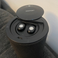 Bluetooth kajari, jossa on kuulokkeet mukana. Toisesta kuulokkeesta on pehmuste hävinnyt.