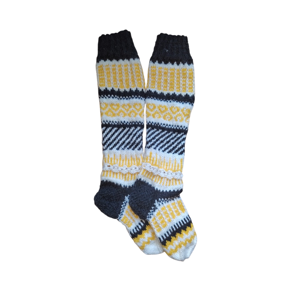 Käsinneulotut polvisukat, villaiset, keltamustavalkoinen kuosi.