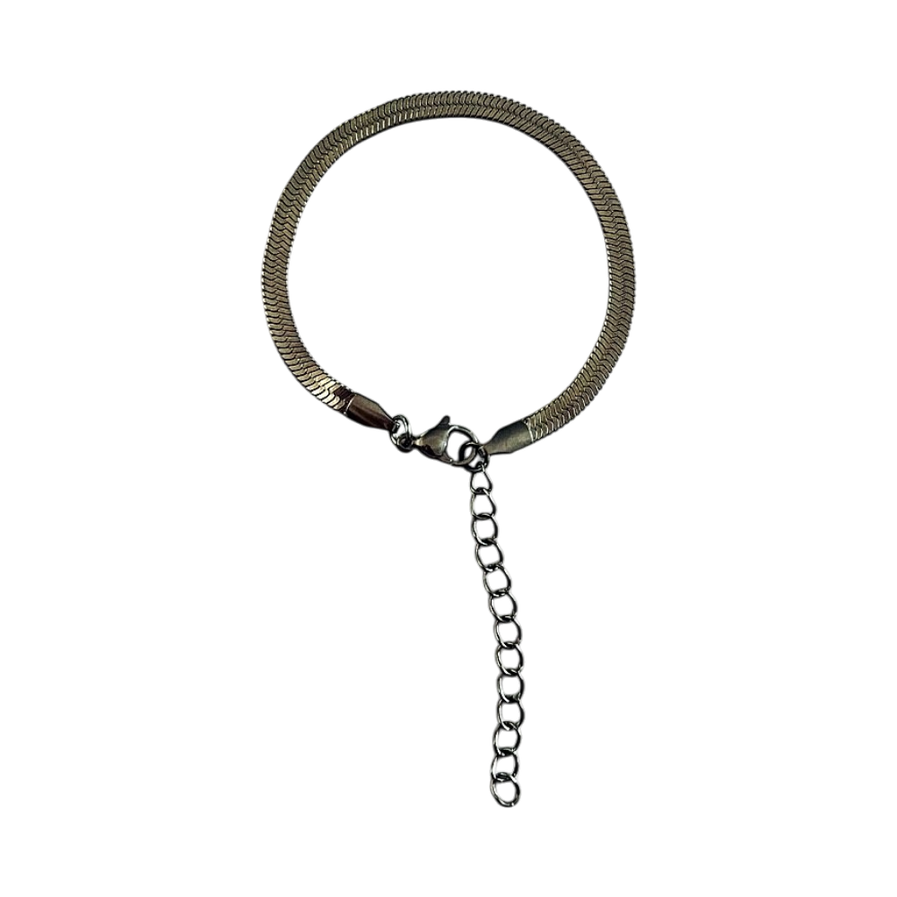 Hopean värinen rannekoru. Pituus noin 16,5cm-21,5cm.