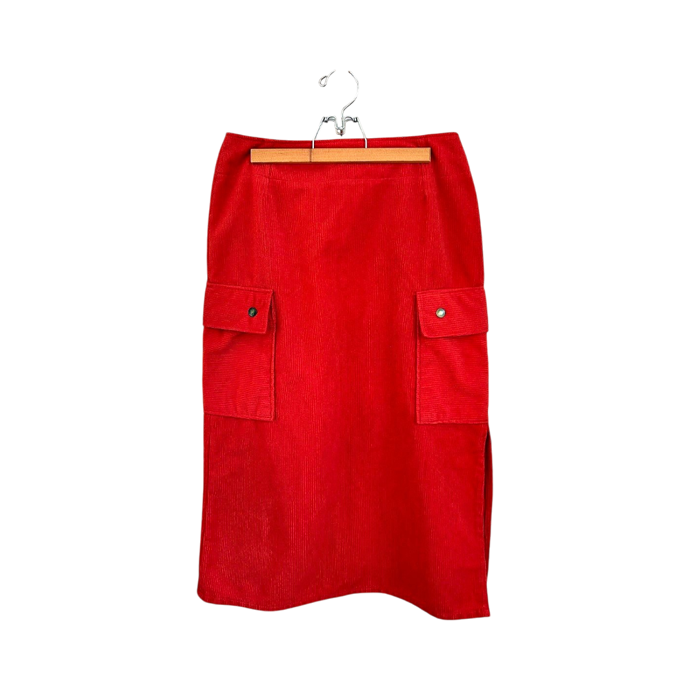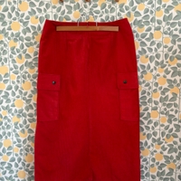 Upean punainen puolipitkä vakosamettihame suurilla taskuilla sivuissa, joissa nepit. Hyvä kunto.