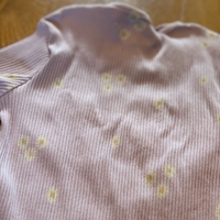 Paita on hyvässä kunnossa, ei tahroja tai kulumaa. Materiaali on ribbineulosta, joka joustaa mukavasti ja istuu kauniisti. Hieman röyhelöreunat helmassa ja hihoissa tuovat tyttömäistä ilmettä.
