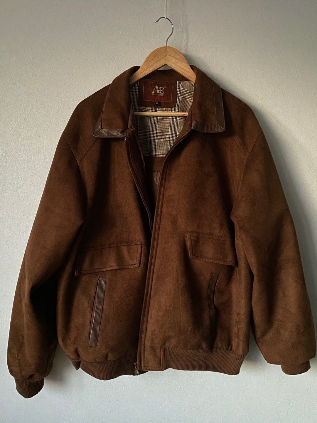 Ruskea ja lämmin mokkanahkainen bombertakki oversize kokoa. Kyynärpäissä ja kauluksessa nahkaiset yksityiskohdat. Edessä useampi iso tasku.