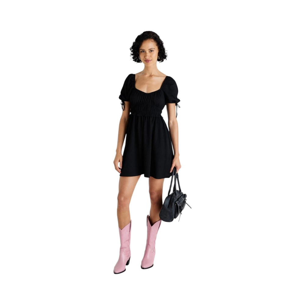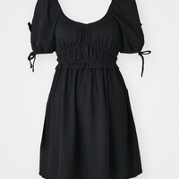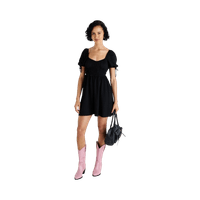 Lyhyt musta mekko, liehuva helma ja lyhyet pussihihat. Uusi, hintalappu kiinni.