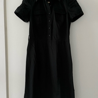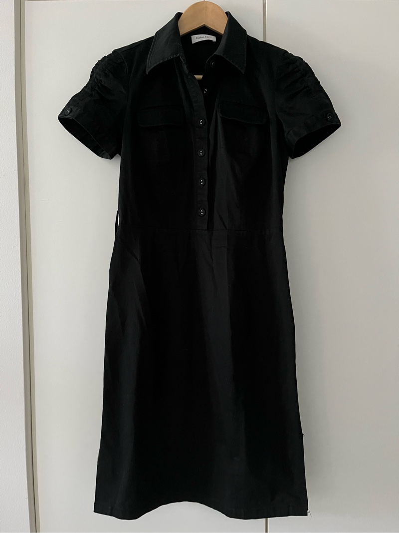 Calvin Kleinin musta mekko. Napitus edessä, piilovetoketju kyljessä, vyölenkit ja helmassa halkiot sivuilla. En löytänyt kokoa mutta istuu S/M kokoiselle. Siistissä kunnossa