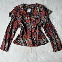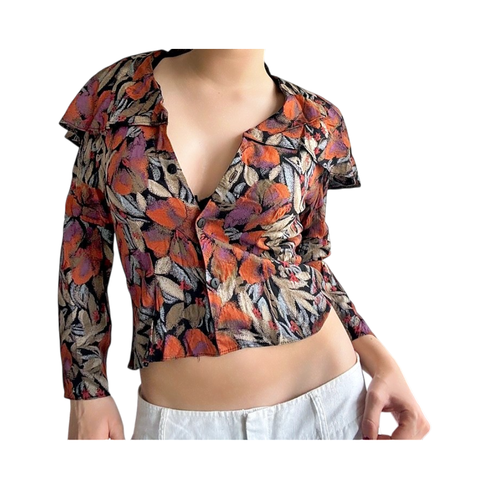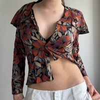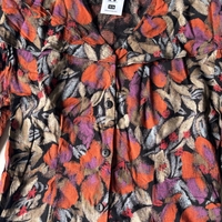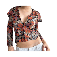 Retro tummansävyinen, kirjava kauluspaita, jossa iso leveä ”kaulus”, joka menee kokonaan ympäri selän. Hihat ovat vähän cropatut ja paidassa on olkatoppaukset, jotka voi kyllä helposti leikata pois jos ei tykkää. Koko S-M. 100% viskoosia.
