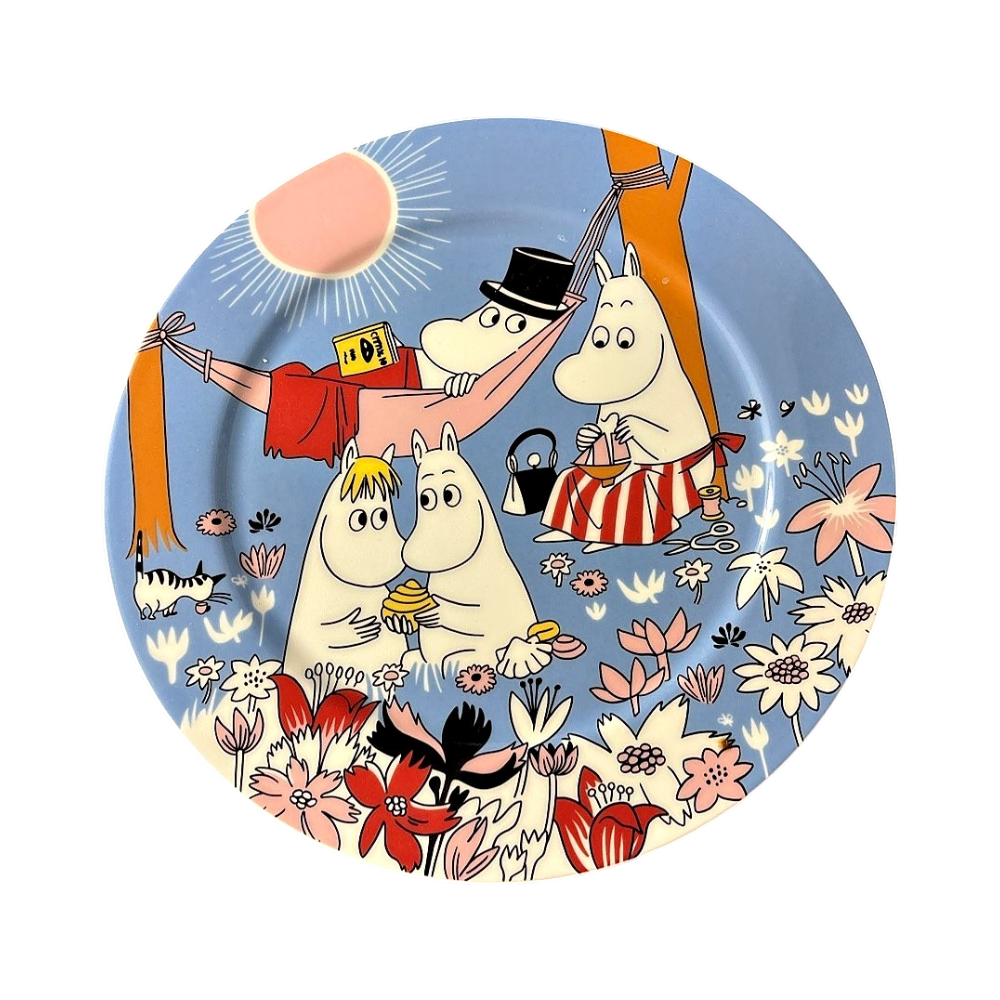 Charming plate featuring Moomin characters and flowers.