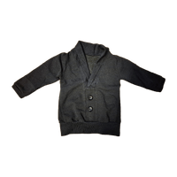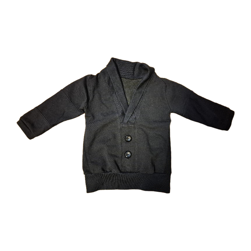 Musta collegepusero, edessä kaksi nappia, pitkähihaiset hihat. Käsityönä tehty, pidetty koossa 90 cm. Kangas tasaista collegekangasta. Kuviin jostain syystä tuli elävän näköinen pinta.