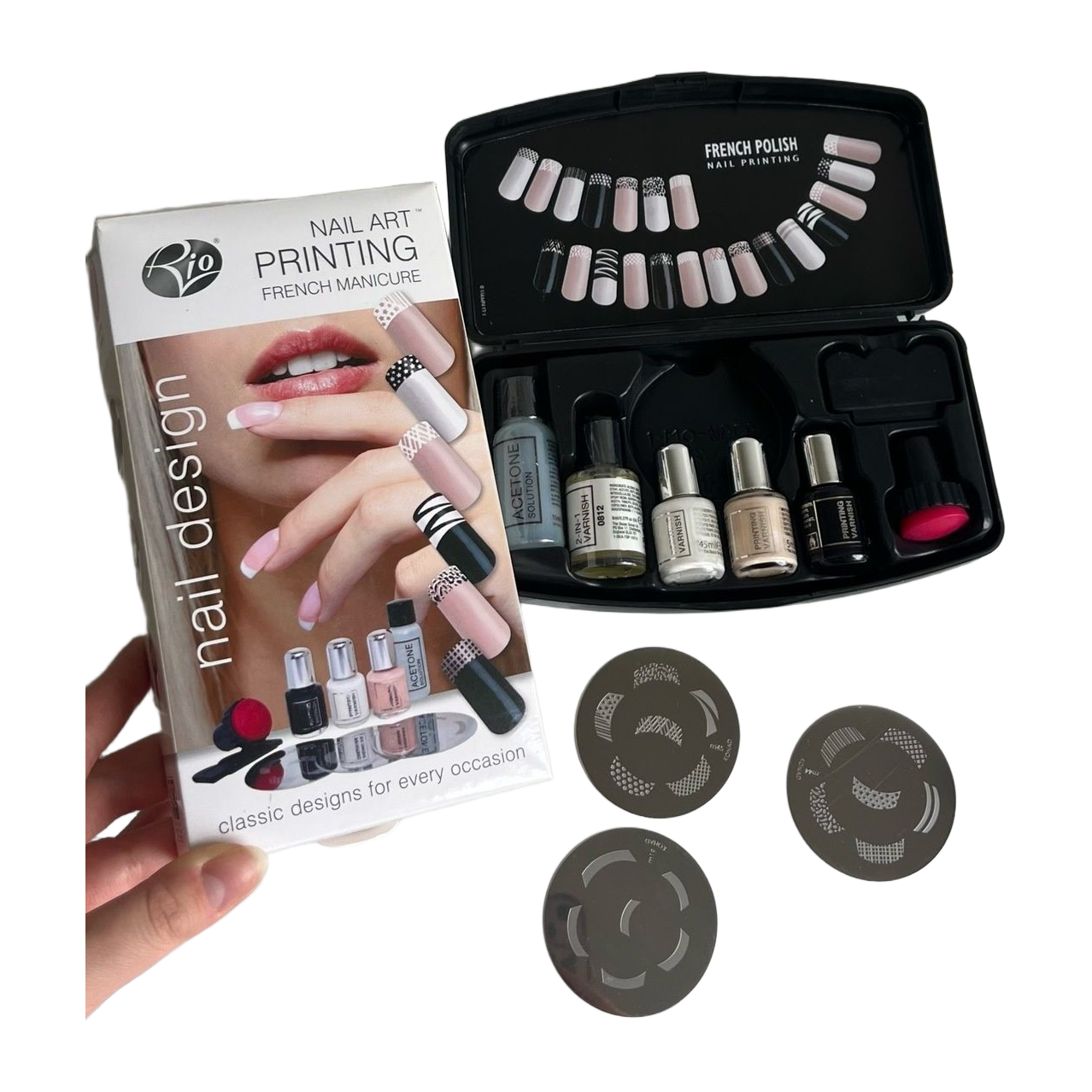 Nail art printing french manicure setti.🥰 Kynsilakat ja muut pullot avaamattomia. Asetoniliuos melkein kokonaan haihtunut pois vaikkei sitä ole edes avattu, mutta kynsilakanpoistoaine ajaa saman asian.
