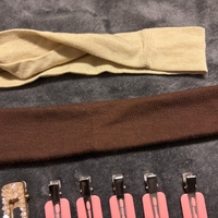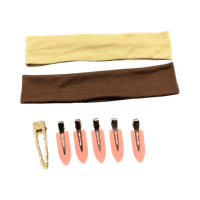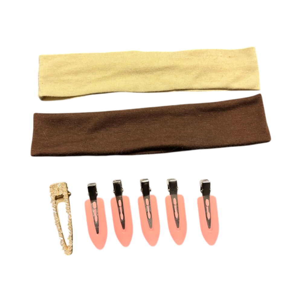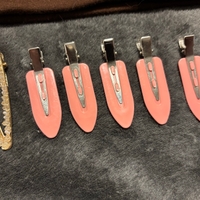 Kaksi hiuspantaa jotka venyy ja viisi vaaleanpunaista pinniä ja yksi koristeellisempi.