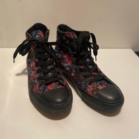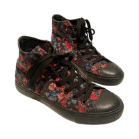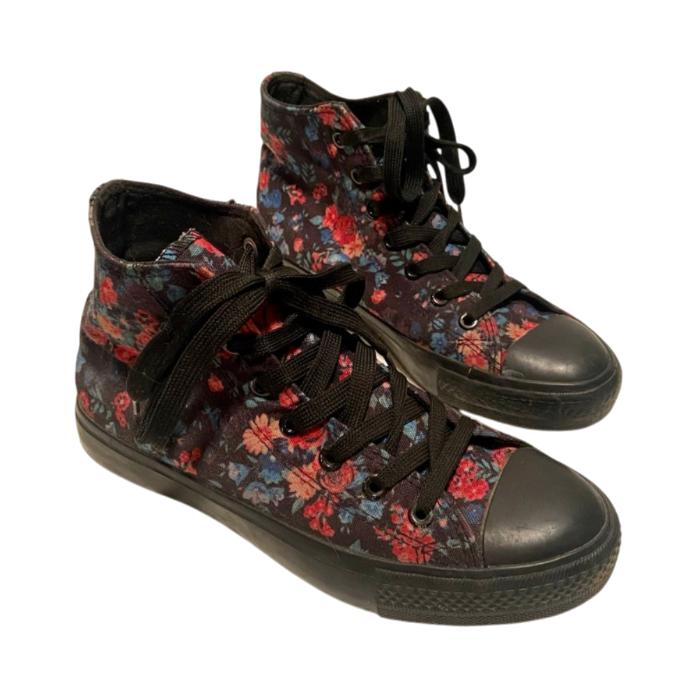 Korkeavartiset kangaslenkkarit kukkakuosilla, mustat kumipohjat.