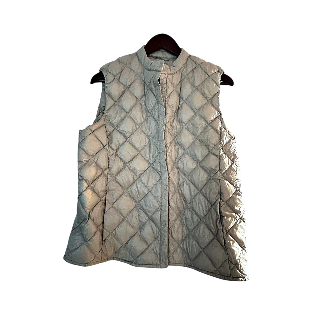 Vaalean harmaa Uniqlo kevyttoppaliivi: hieman kiiltävä pinta, edessä napit. Niukahko Uniqlo-mitoitus.