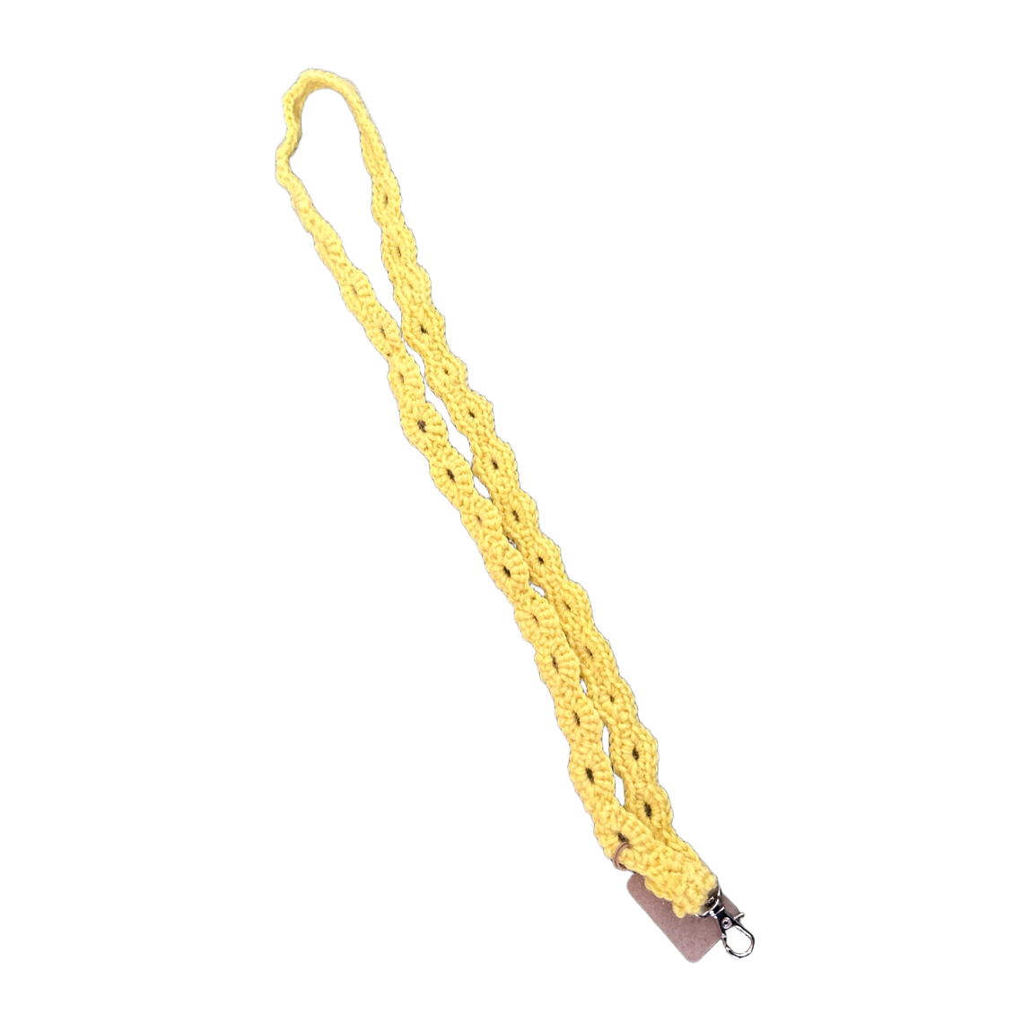 Käsin virkattu keltainen avainnauha metallikiinnikkeellä. noin 36 cm
