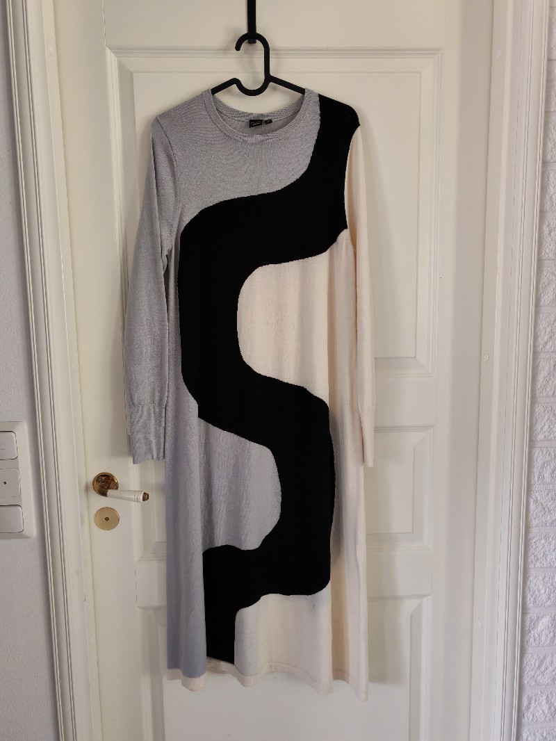 Pitkä neulemekko kuviolla, koko M. Helmassa tumma jälki.