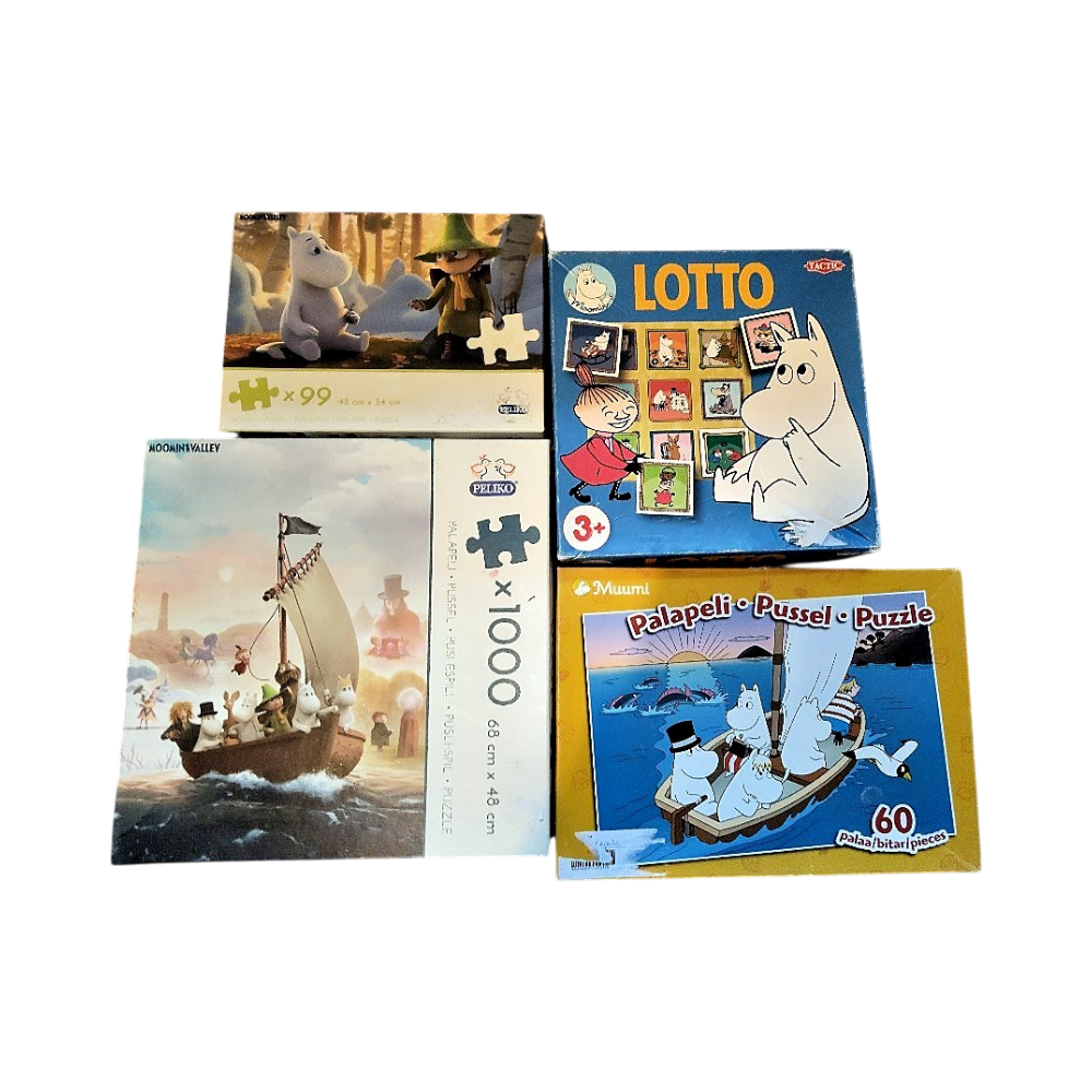 Myydään kolme Muumi palapeliä ja Muumi lotto.