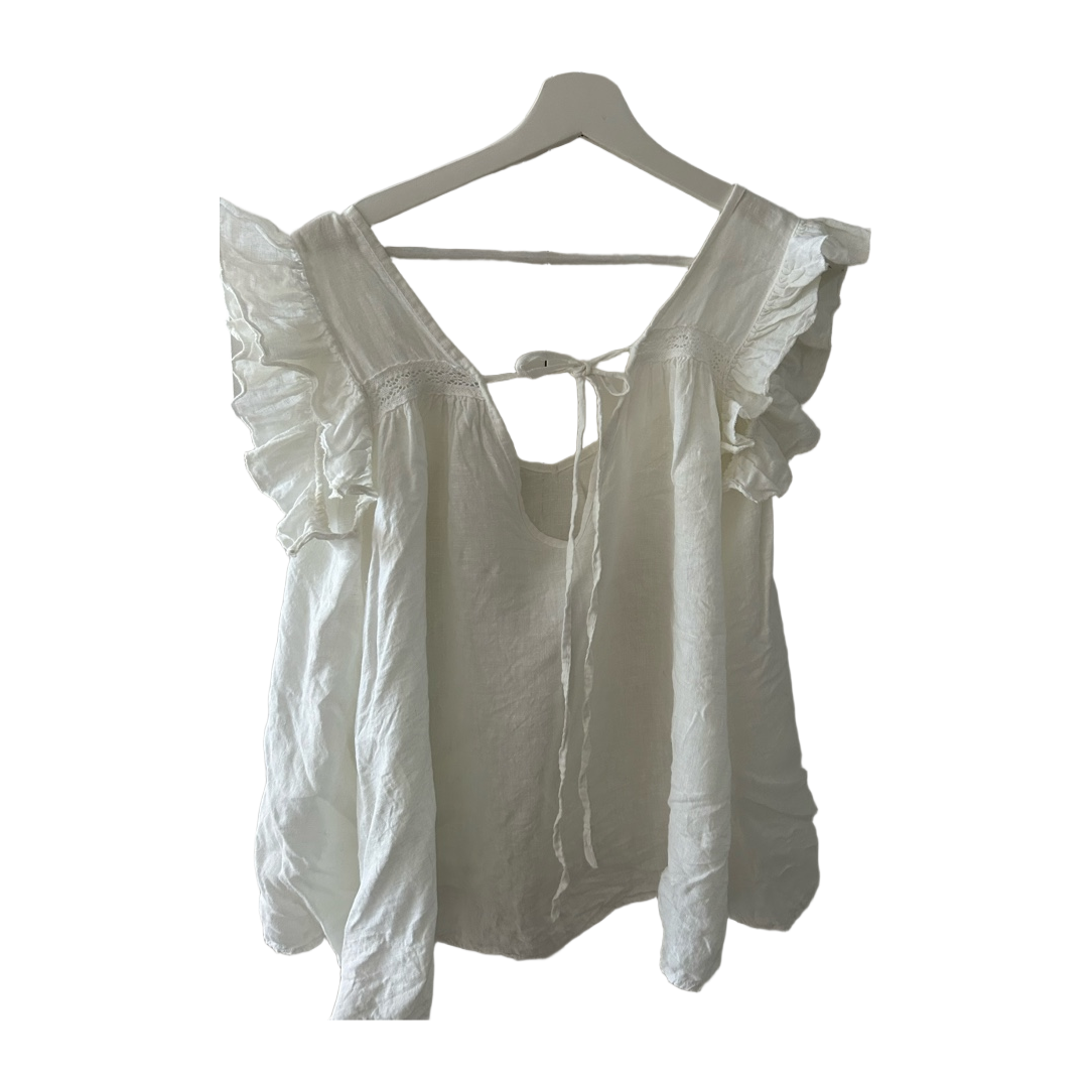 Valkoinen pusero röyhelöhihoilla ja nyörisomisteella.