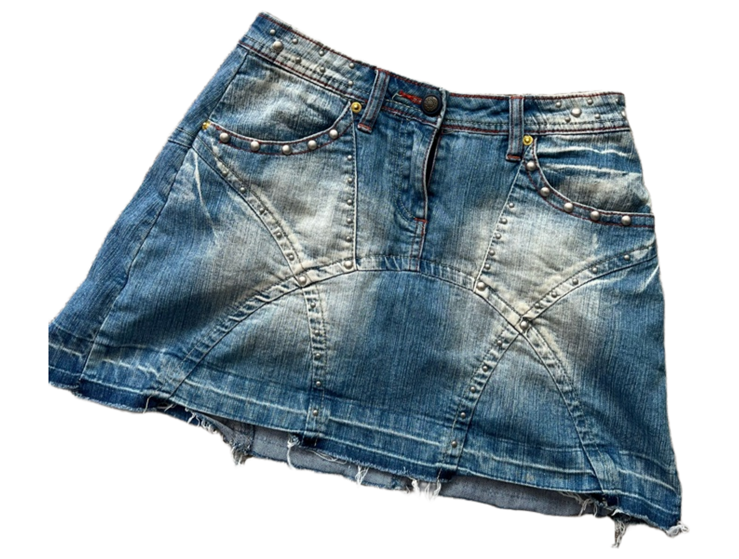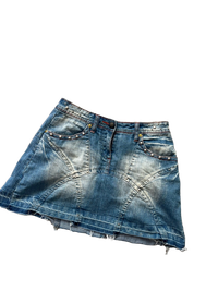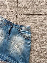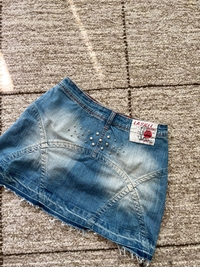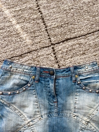 Lyhyt farkkuhame, joustaa hieman. Oikein siistissä kunnossa. Koko s, pituus 36cm ja vyötärönympärys noin 70cm