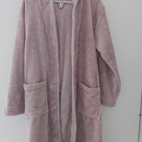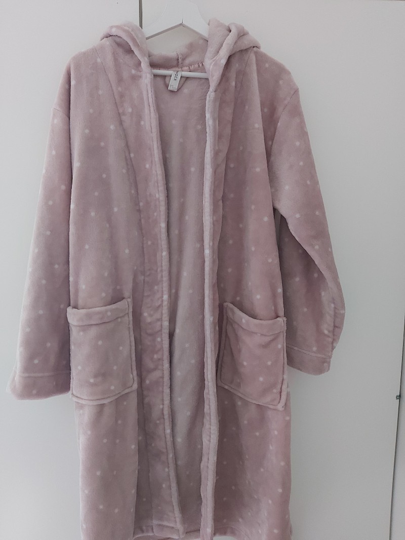 Pehmeä ja lämmin vaaleanpunainen kylpytakki valkoisilla pilkuilla, hupullinen. Hieman värjäytymään.