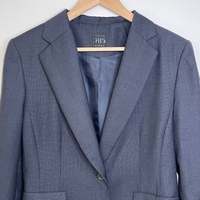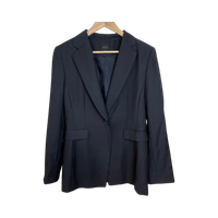 Klassinen naisten tummansininen bleiseri, vuorellinen, erittäin siisti kunto. Yhden napin kiinnitys, valetaskut. Yhteensopiva hame myös myynnissä kaapissani.