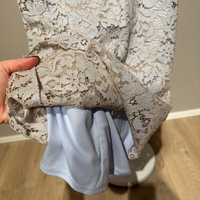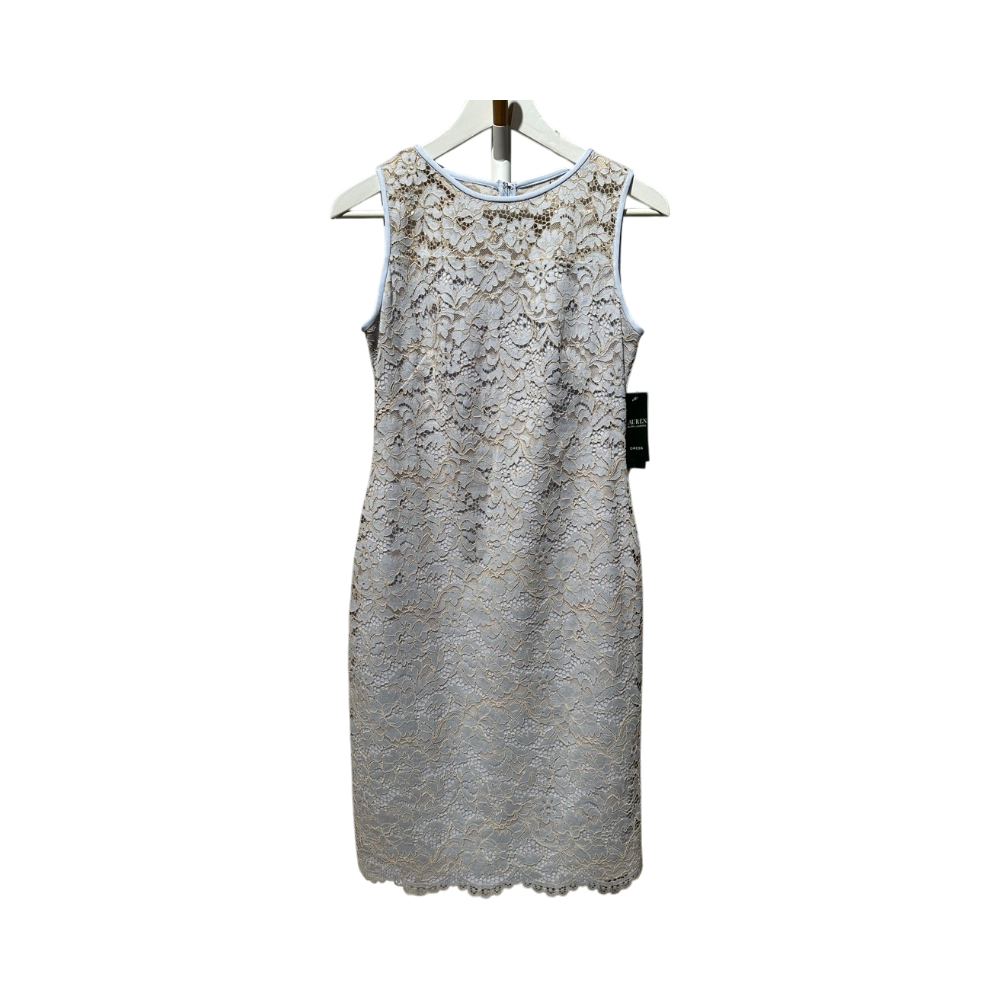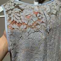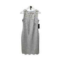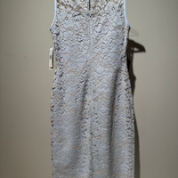 Light blue sheath dress with beige floral lace overlay, knee-length.